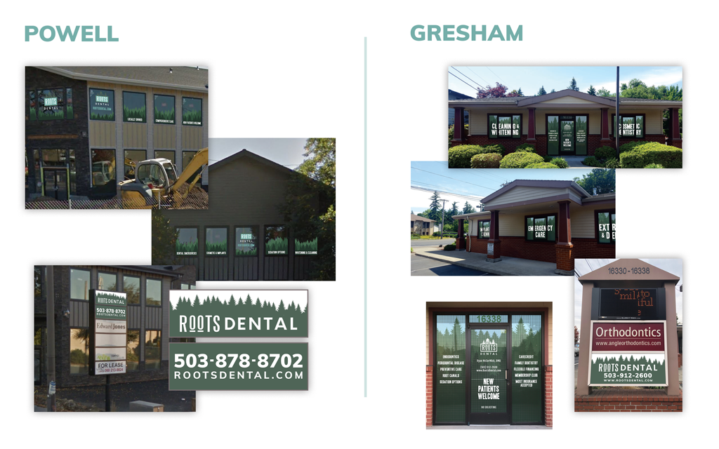 Vinyls: Design of vinyl wraps for the outdoor look of the dental offices in Powell, Hollywood and Gresham.